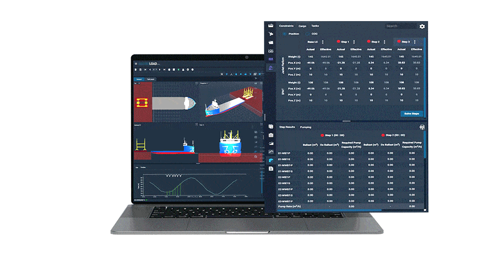 SecureLoad replaces isolated loading conditions with a step-based operational workflow. Users can model complete operations such as Load-In and Load-Out, Lift-On and Lift-Off, and Float-In and Float-Out within a single worksheet. Each step represents a defined operational stage, and stability, strength, and ballast conditions are recalculated at every step.