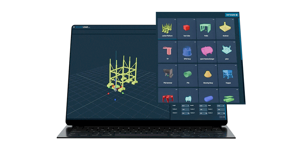 SecureLoad includes a centralized cargo template library shared across the vessel. Users can select from predefined cargo templates covering common cargo types and adapt them as required. Custom cargo geometry can be uploaded and stored as reusable templates, ensuring consistent representation across multiple loading studies.Â